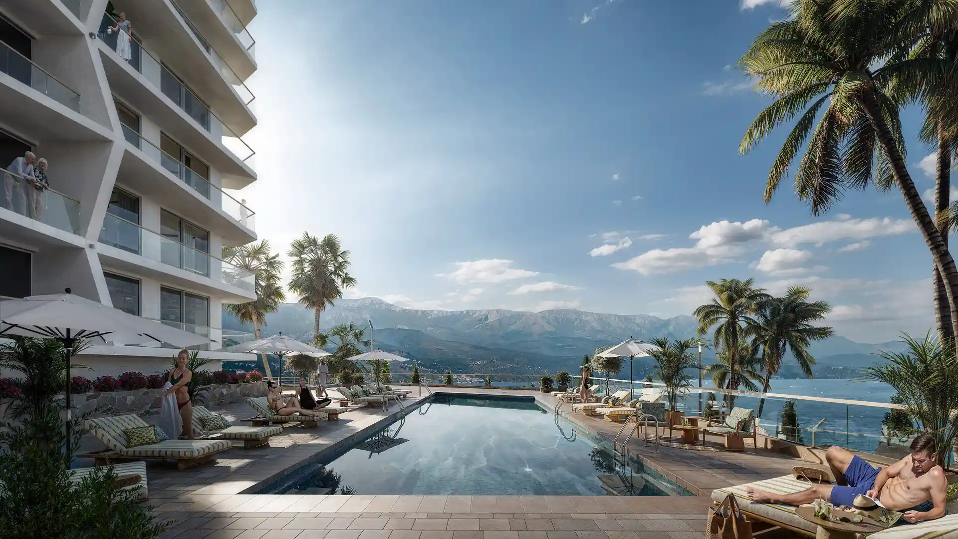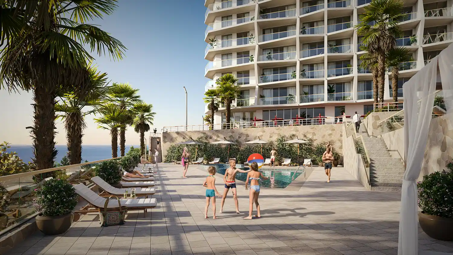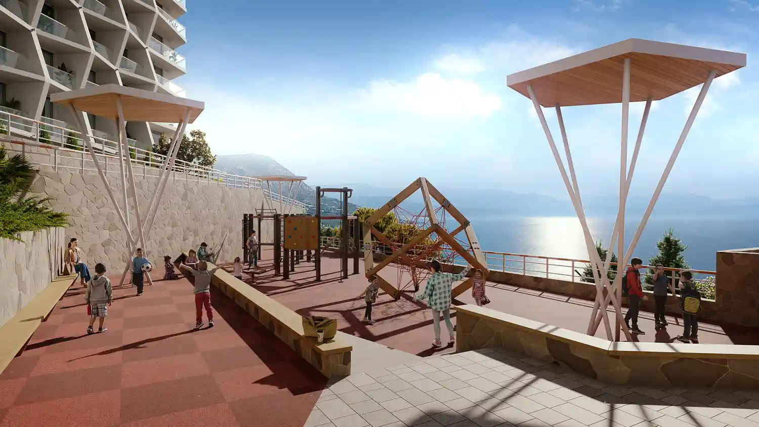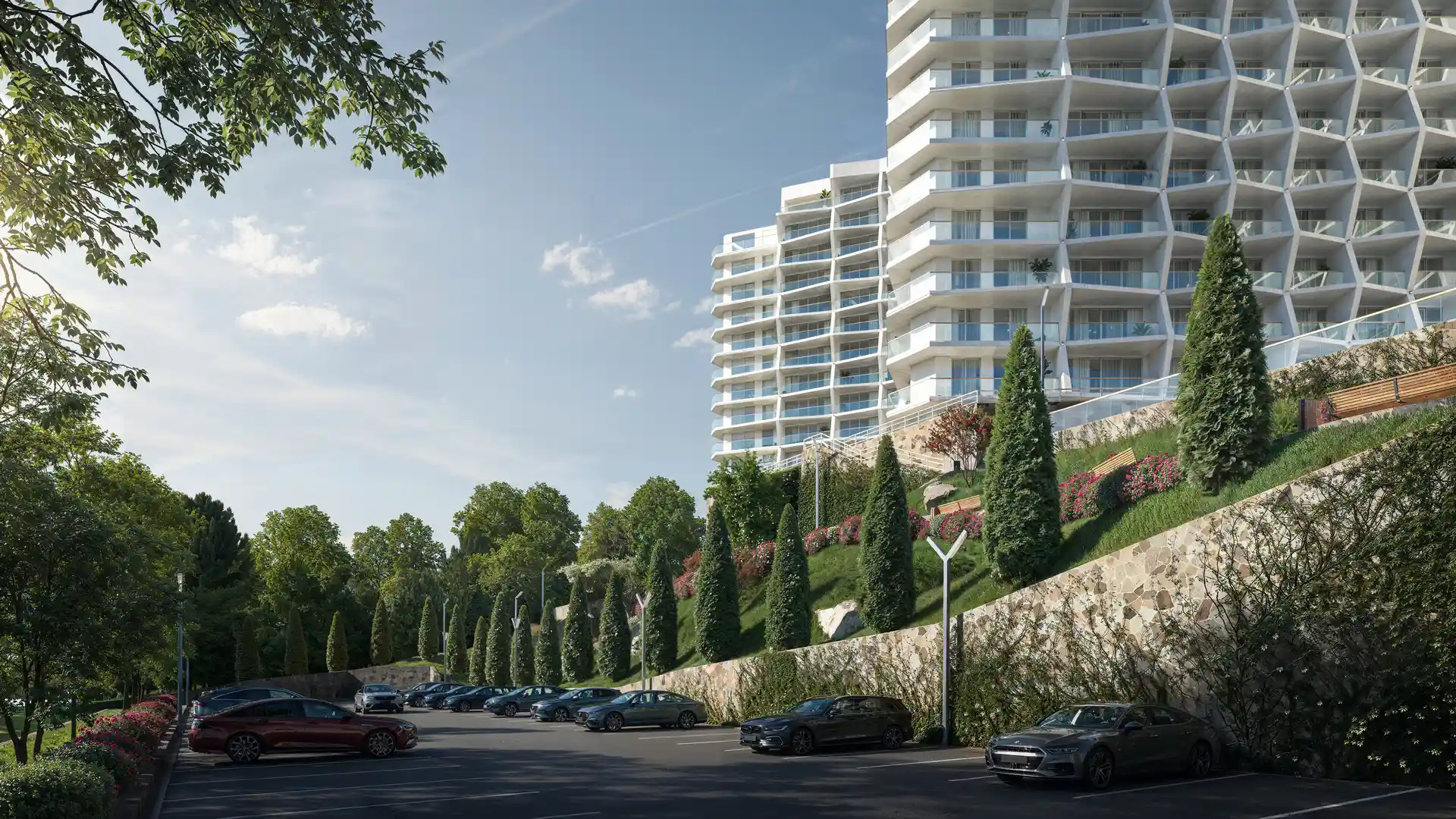 В каждом апартаменте предусмотрена открытая терраса, с которой открываются панорамные виды на южное побережье, набережную и окрестности поселка Утес. Инфраструктура комплекса спроектирована для комфортного отдыха и включает два открытых бассейна для взрослых и детей, спа-центр с бассейном, авторский ресторан, бизнес-зал, детские игровые зоны и спортивную площадку. Для общего пользования жильцов будут доступны панорамные террасы на 14 этаже, благоустроенная парковая территория с беседками, а также комфортабельные холлы в каждой башне и архитектурная подсветка.