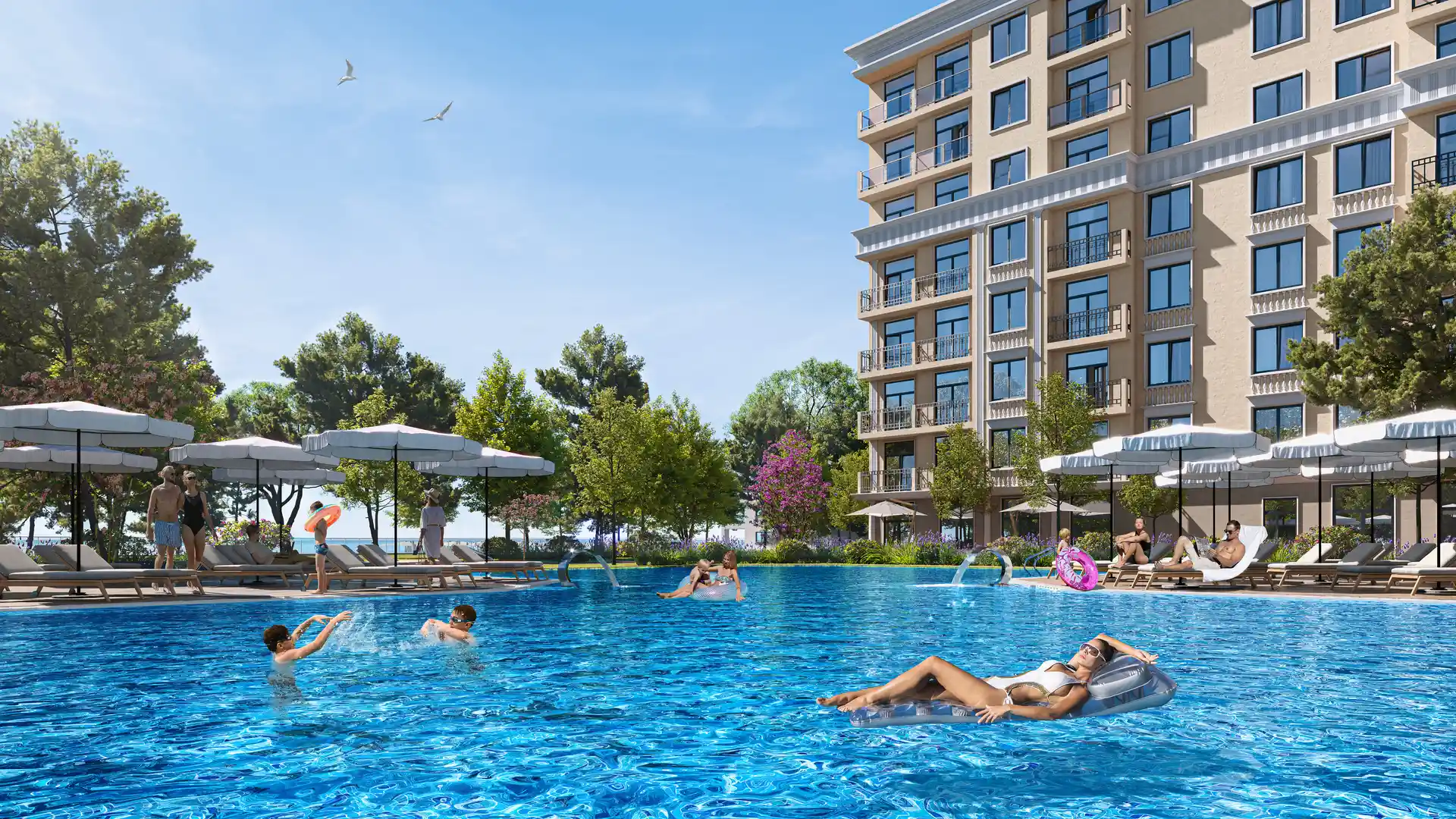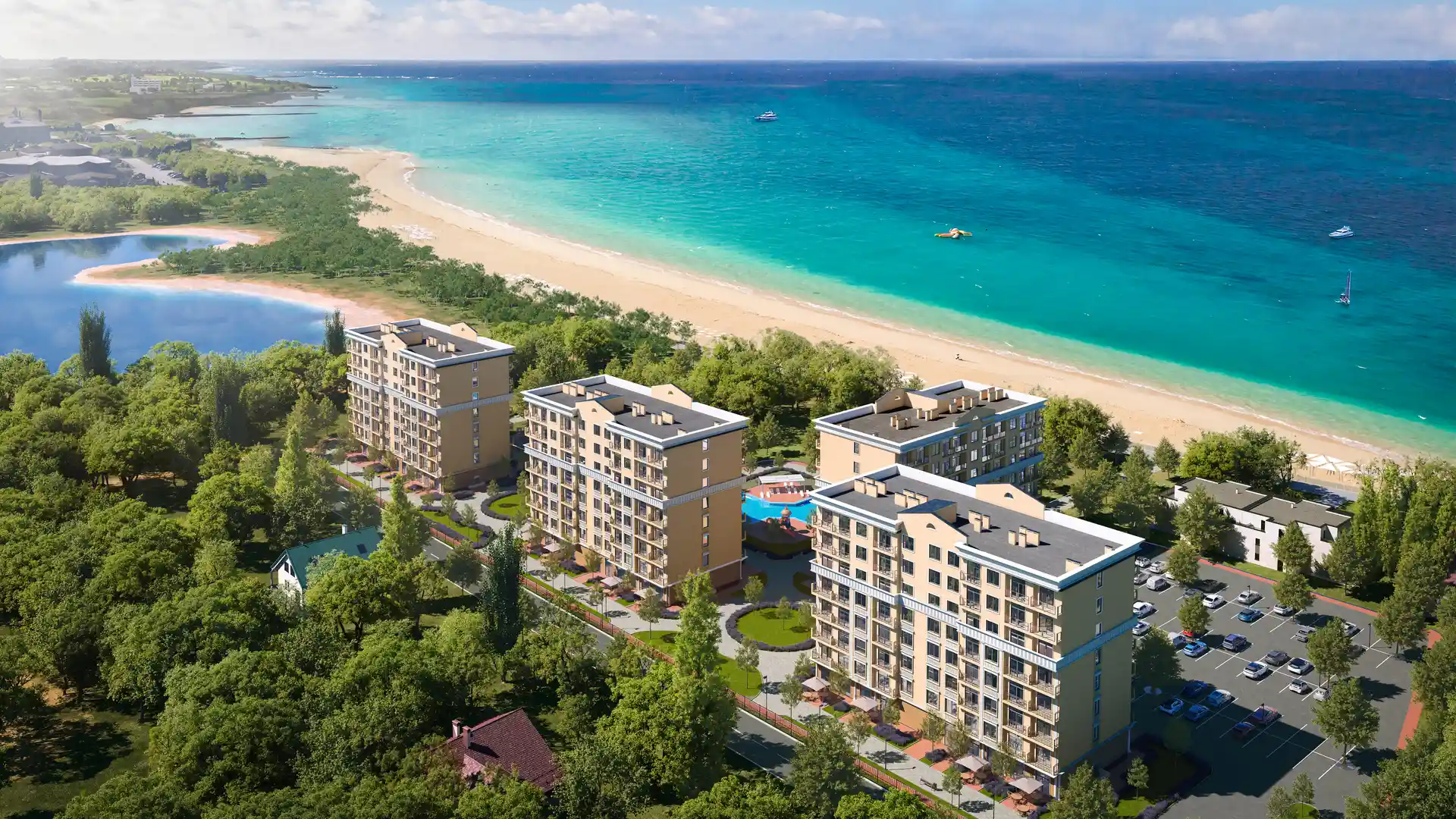 Комплекс состоит из четырёх 8-этажных корпусов, в которых разместится более 390 апартаментов различных форматов: от уютных студий от 25,89 м² до просторных трёхкомнатных вариантов. На благоустроенной территории площадью 8000 м² создана полноценная курортная инфраструктура: аквазона, SPA-комплекс, фитнес-клуб, зоны для барбекю, детские и спортивные площадки, а также консьерж-сервис. Для жителей предусмотрено более 200 машиномест.