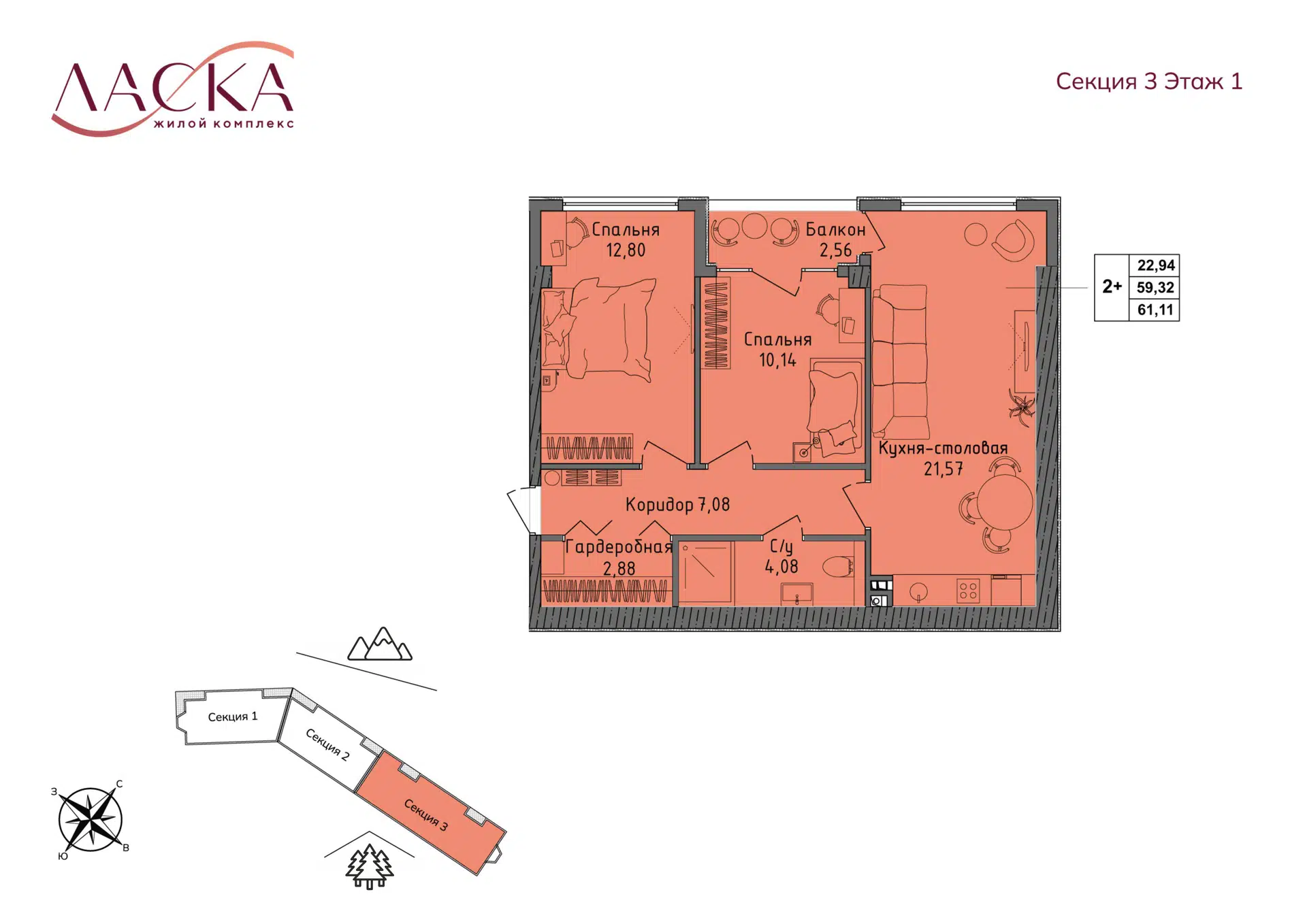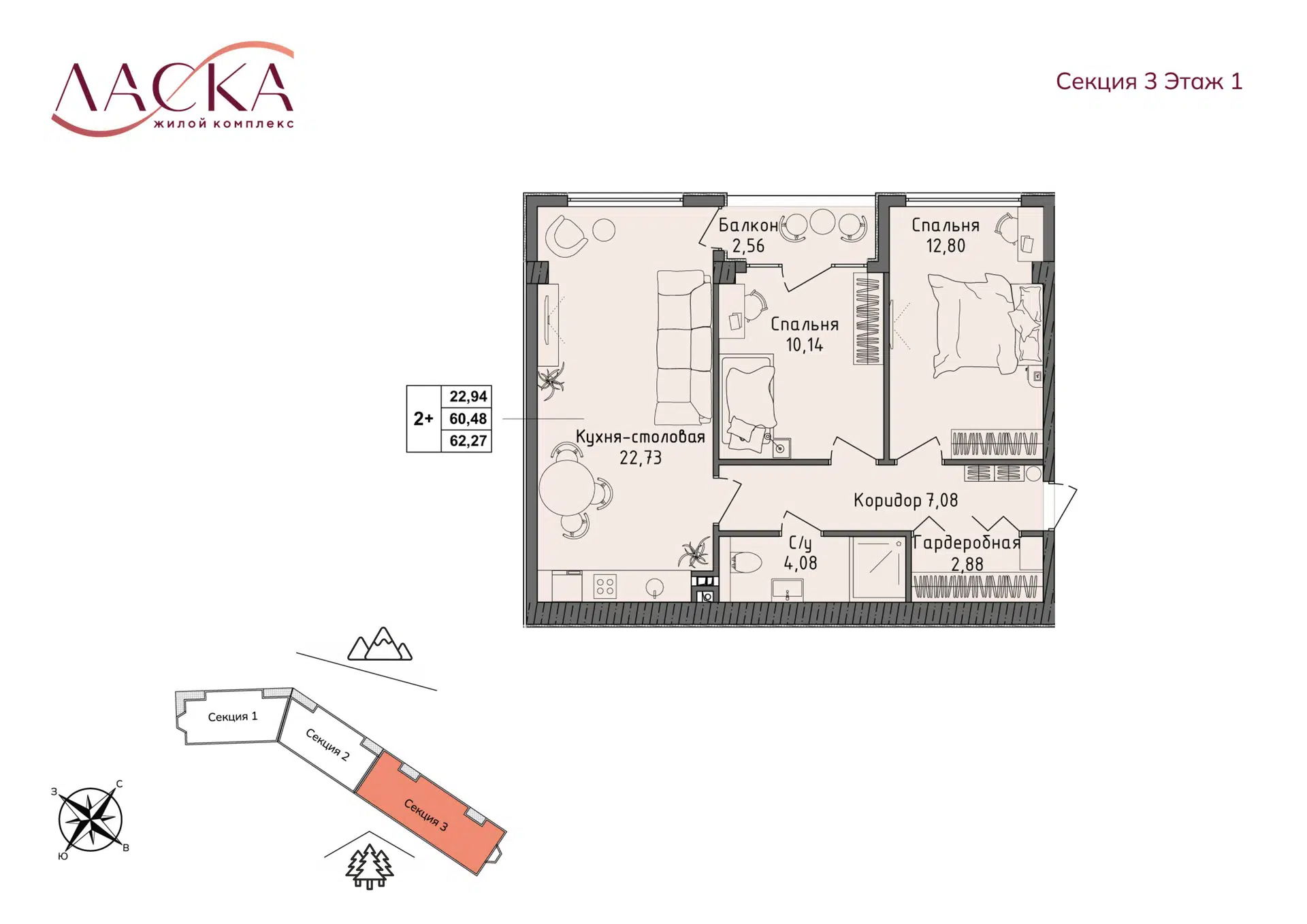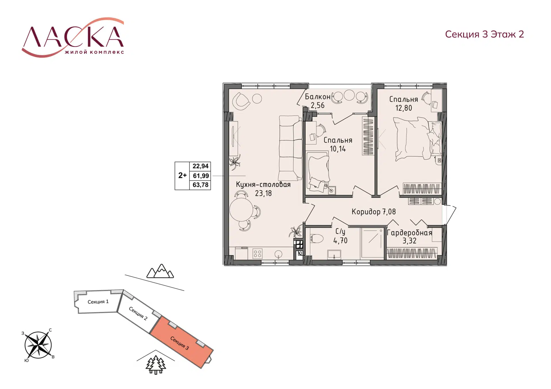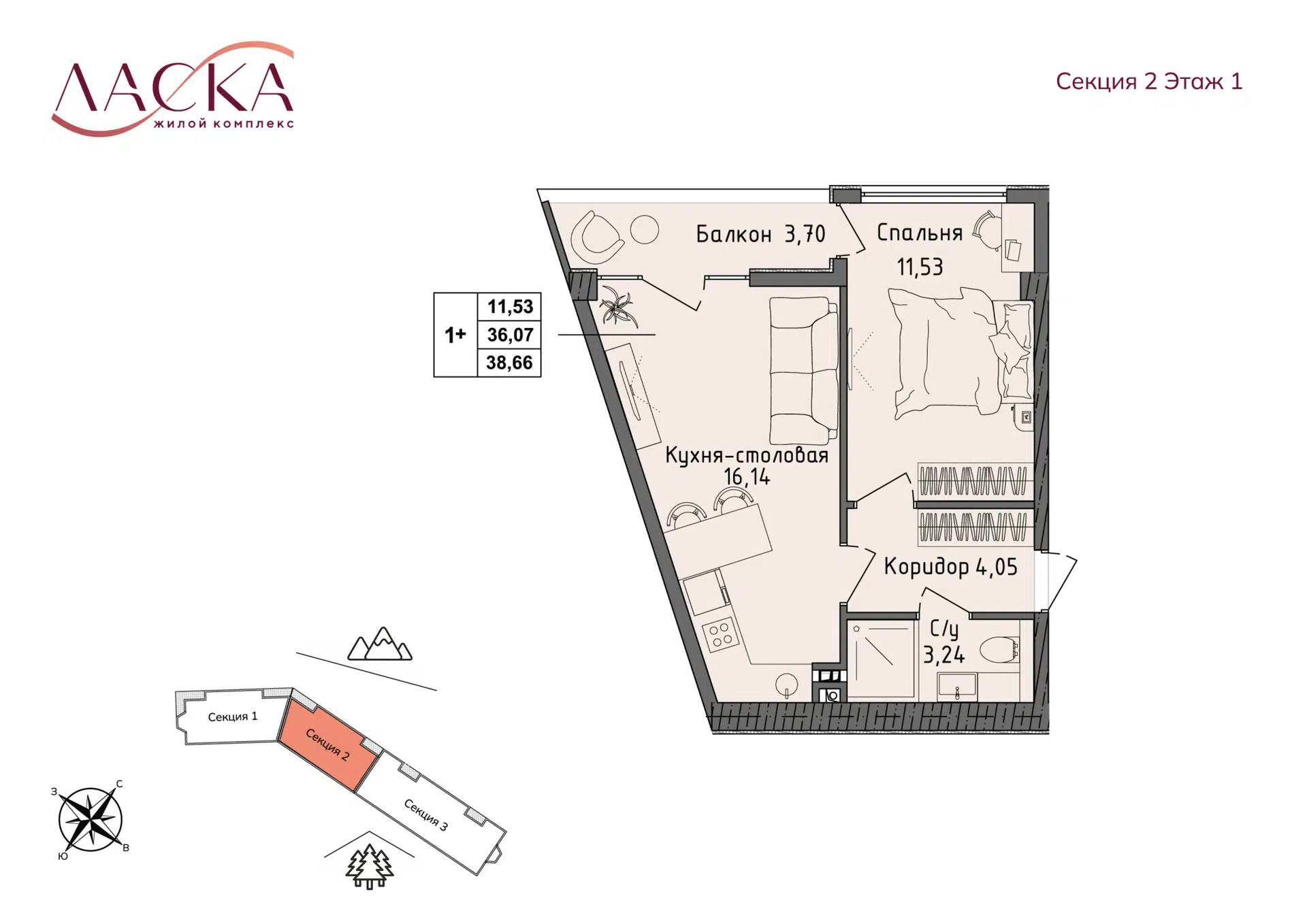 Комплекс предлагает широкий выбор планировок для разных потребностей: сбалансированные студии от 30.24 м², однокомнатные квартиры от 45.81 м² с большими балконами-террасами, просторные двухкомнатные квартиры от 50.15 м² и роскошные угловые трехкомнатные квартиры от 116.89 м² с двумя балконами и двумя санузлами. Жилые пространства спроектированы так, чтобы жители могли наслаждаться красотой Крыма, видами на море и горы, проводя время с семьей и друзьями в уникальной атмосфере у моря.