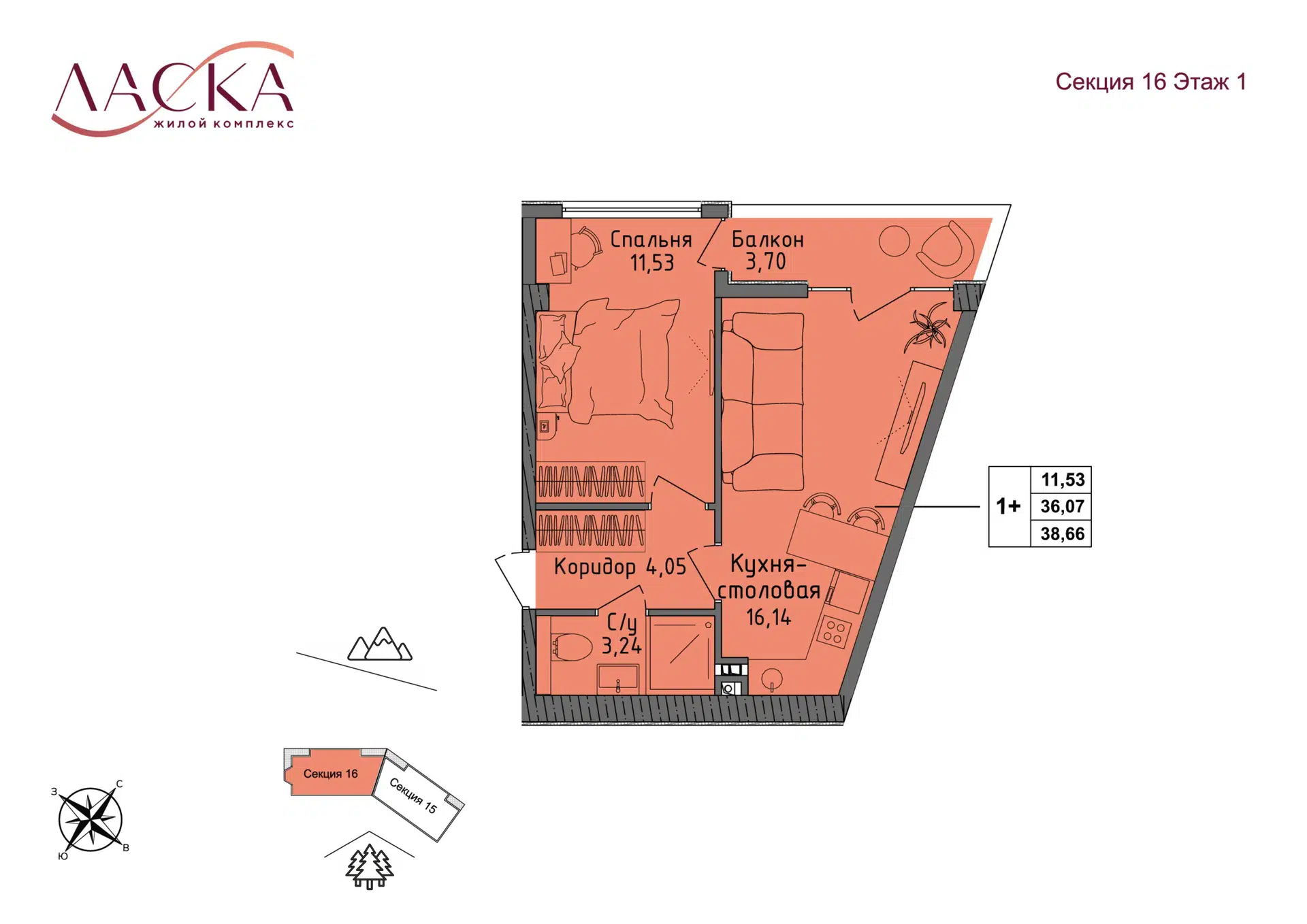 Первая очередь представляет собой жилой комплекс из 16 малоэтажных четырехэтажных секций. Всего здесь 128 квартир, что обеспечивает приватность и уют — на каждом этаже расположено всего по две квартиры.