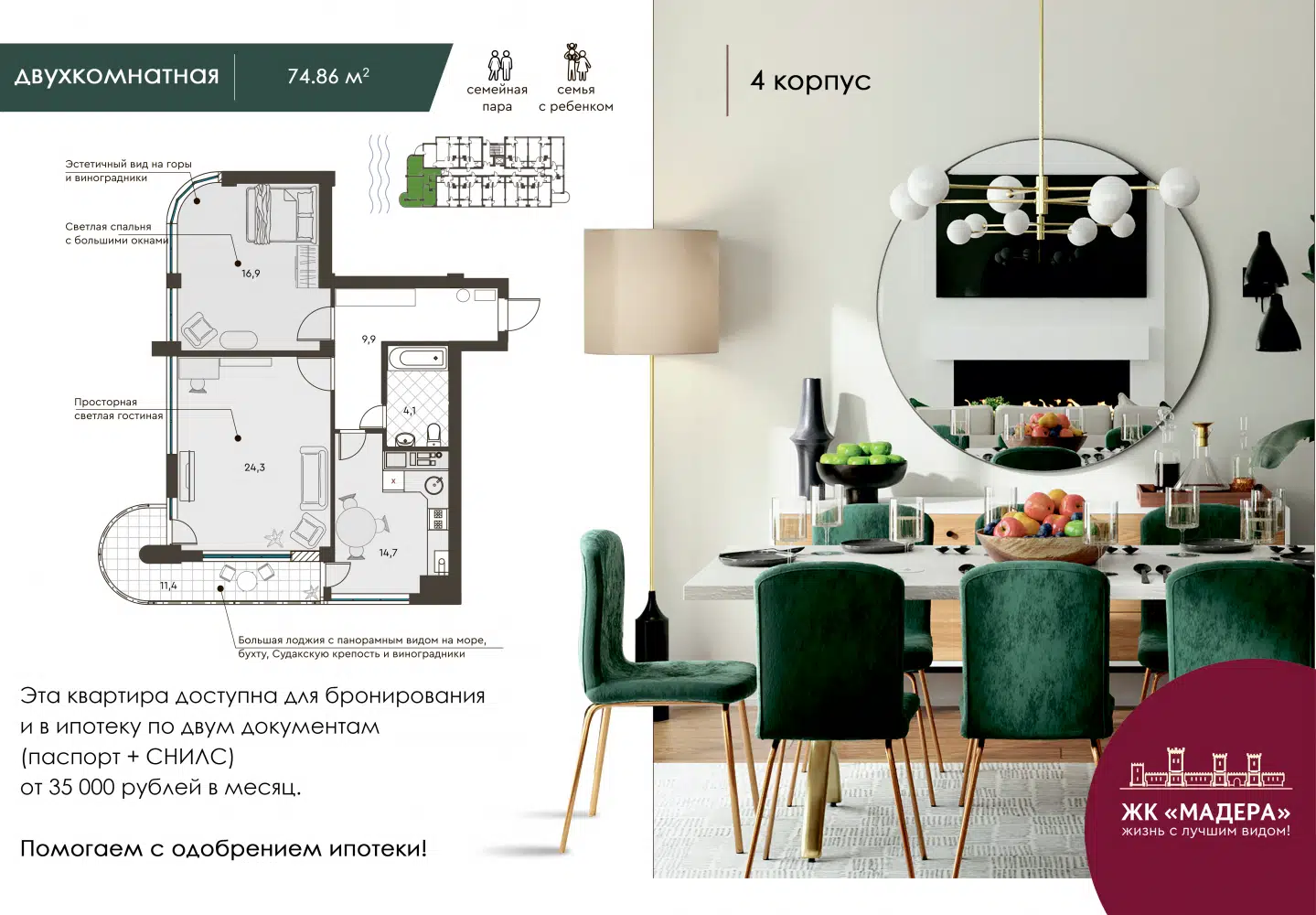 Жилой комплекс «Мадера» в Судаке — это проект комфорт-класса, расположенный в уникальной локации на пересечении трёх стихий: моря, гор и леса. Комплекс состоит из четырёх восьмиэтажных корпусов монолитно-кирпичной конструкции, в которых размещено 280 квартир с видами на Чёрное море, Судакскую крепость, горы и виноградники. Все квартиры имеют предчистовую отделку, высоту потолков до 2,8 метра и возможность перепланировки.