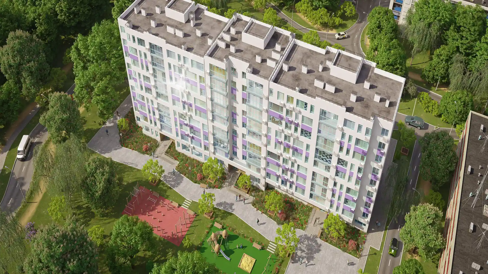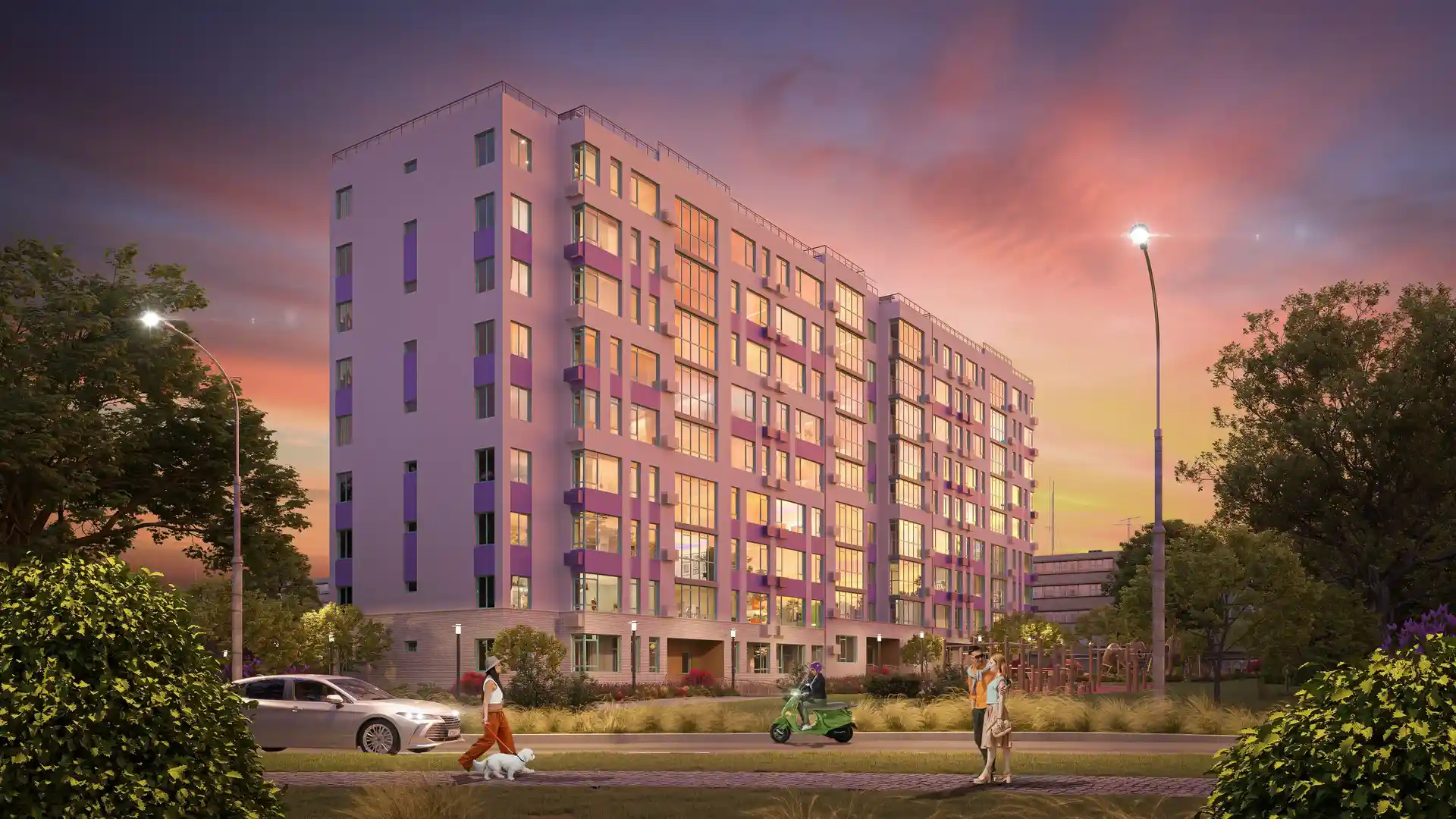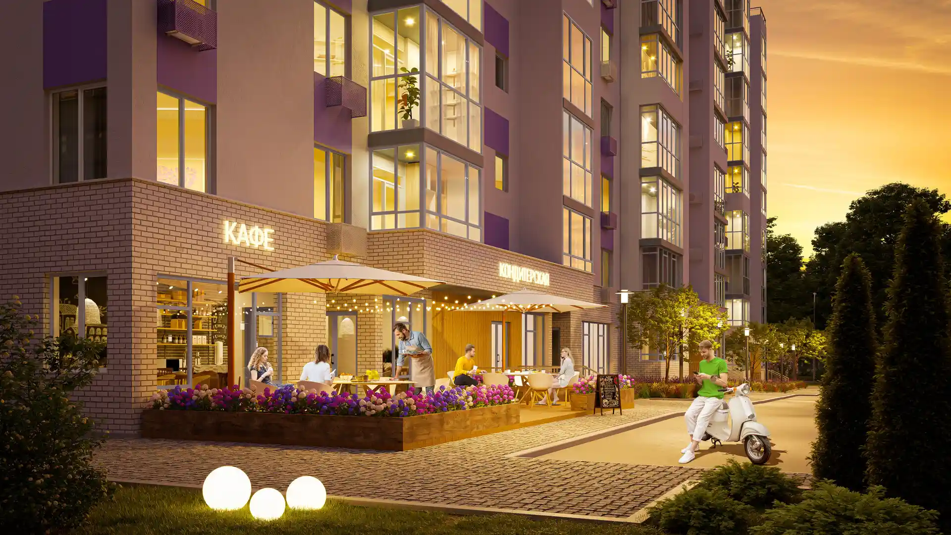 Архитектура здания сочетает прочность монолитно‑каркасной конструкции с эстетикой стиля «Прованс»: фасады оформлены в светлых тонах с сиреневыми акцентами, а увеличенная площадь остекления и панорамные балконы обеспечивают хорошую освещённость квартир. В доме установлены три бесшумных лифта и корзины для кондиционеров. На первых этажах предусмотрены коммерческие помещения — там смогут разместиться кофейни, продуктовые магазины, аптеки и другие объекты торговли и услуг.
