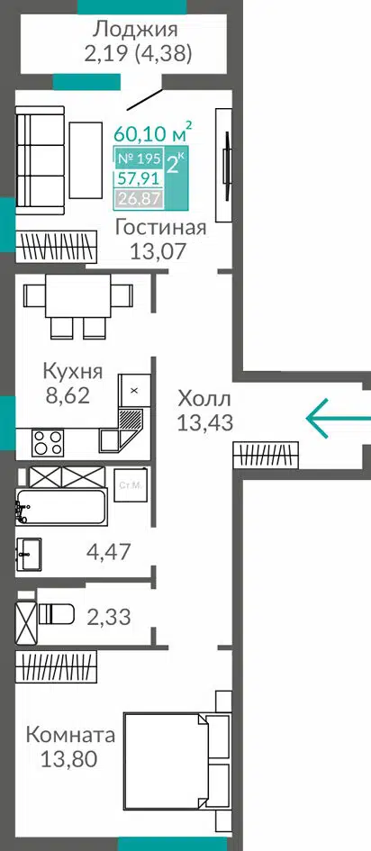 38.51 - 57.99 м²