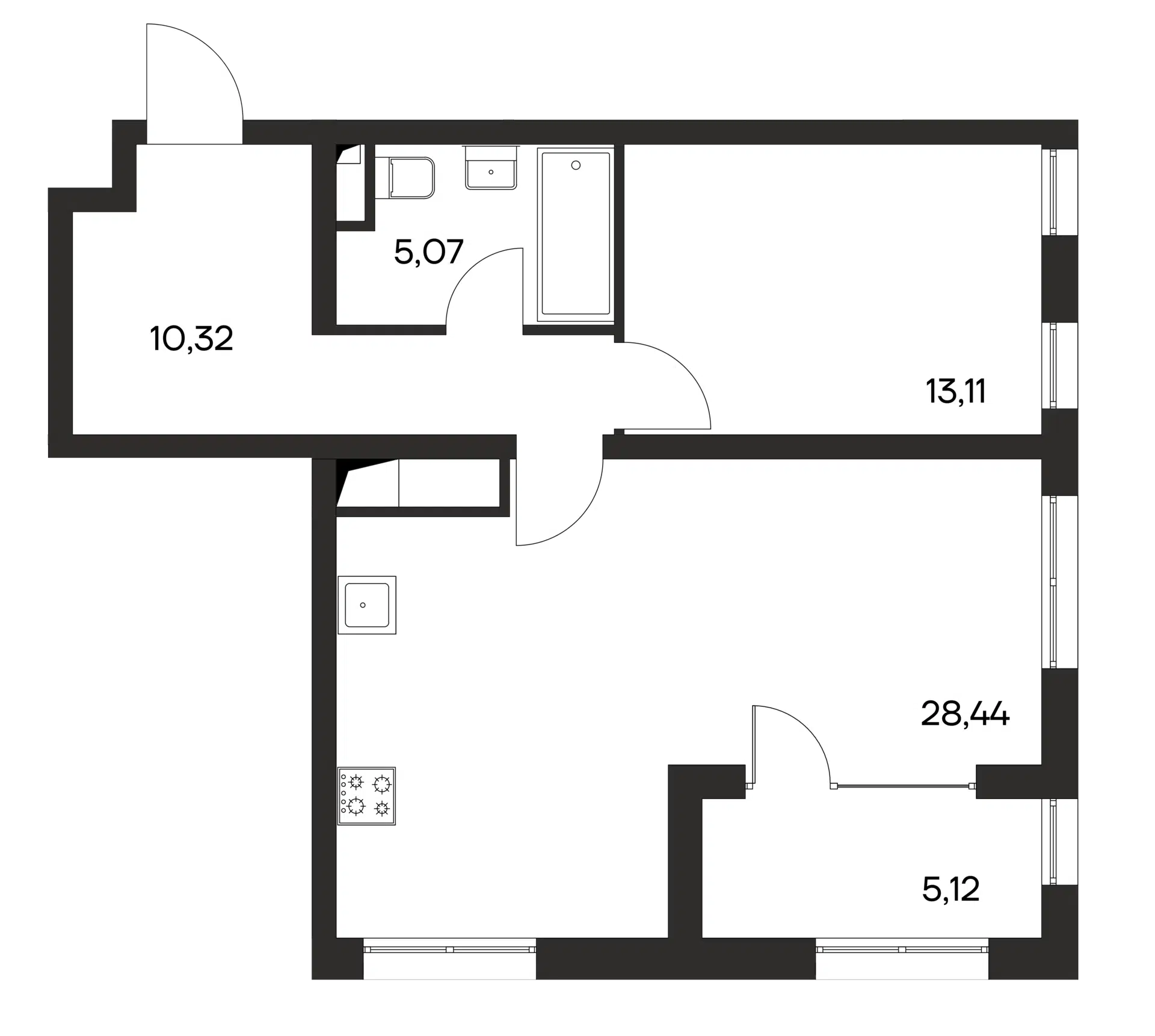 1-комнатная, 45.25 м²