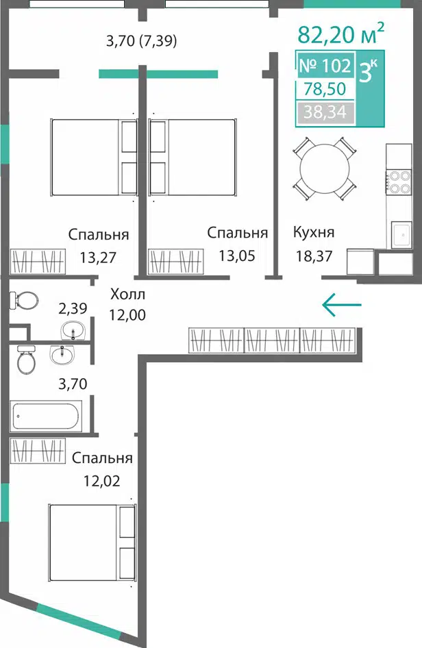 3-комнатная квартира, 77.65 м², 9 эт.