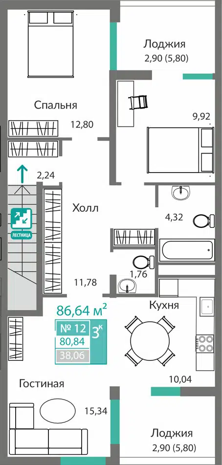 3-комнатная, 81.50 м²