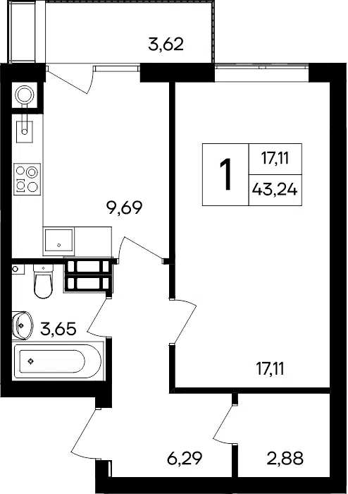 1-комнатная, 40.73 м²