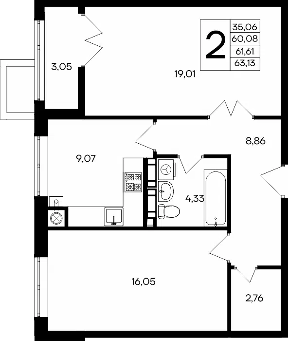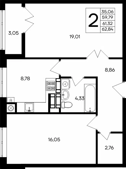 2-комнатная, 62.59 м²