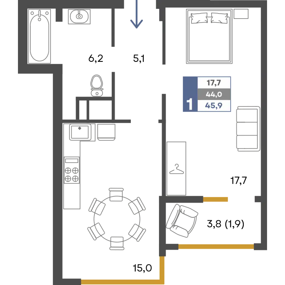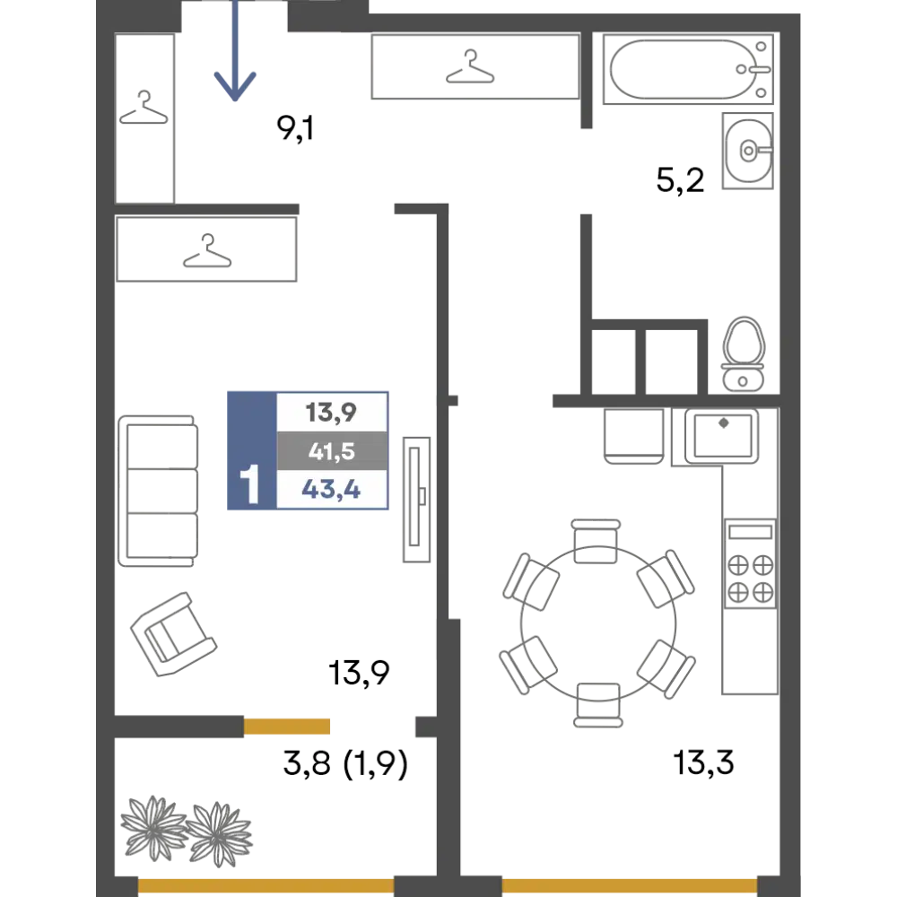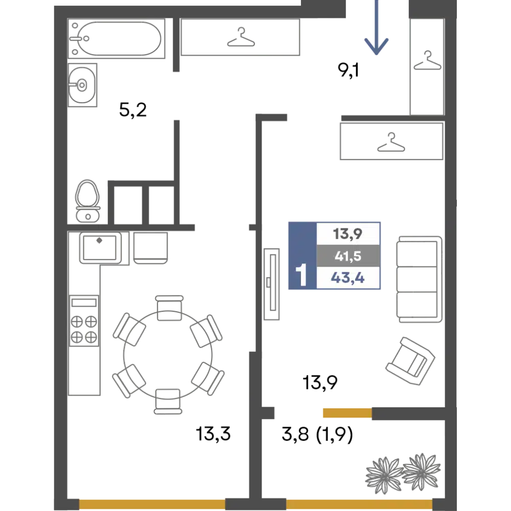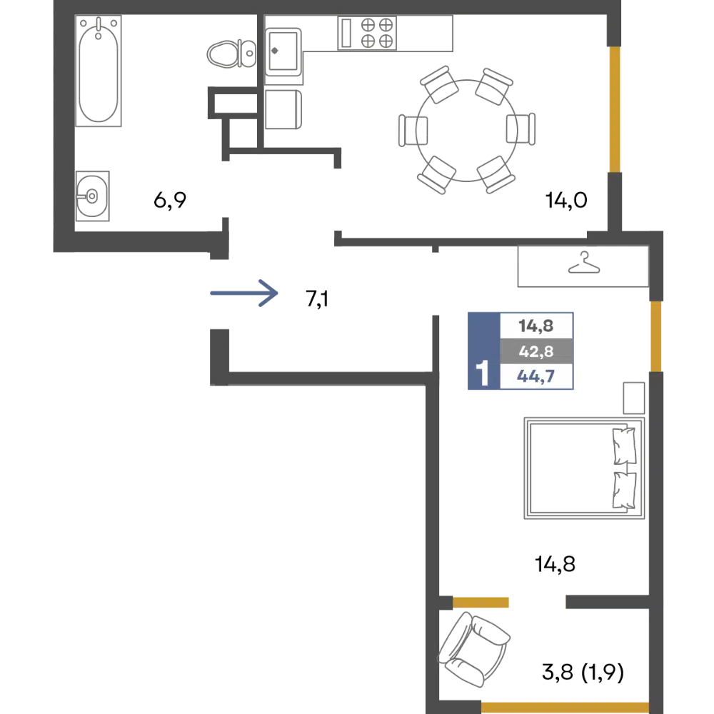 1-комнатная, 44.20 м²