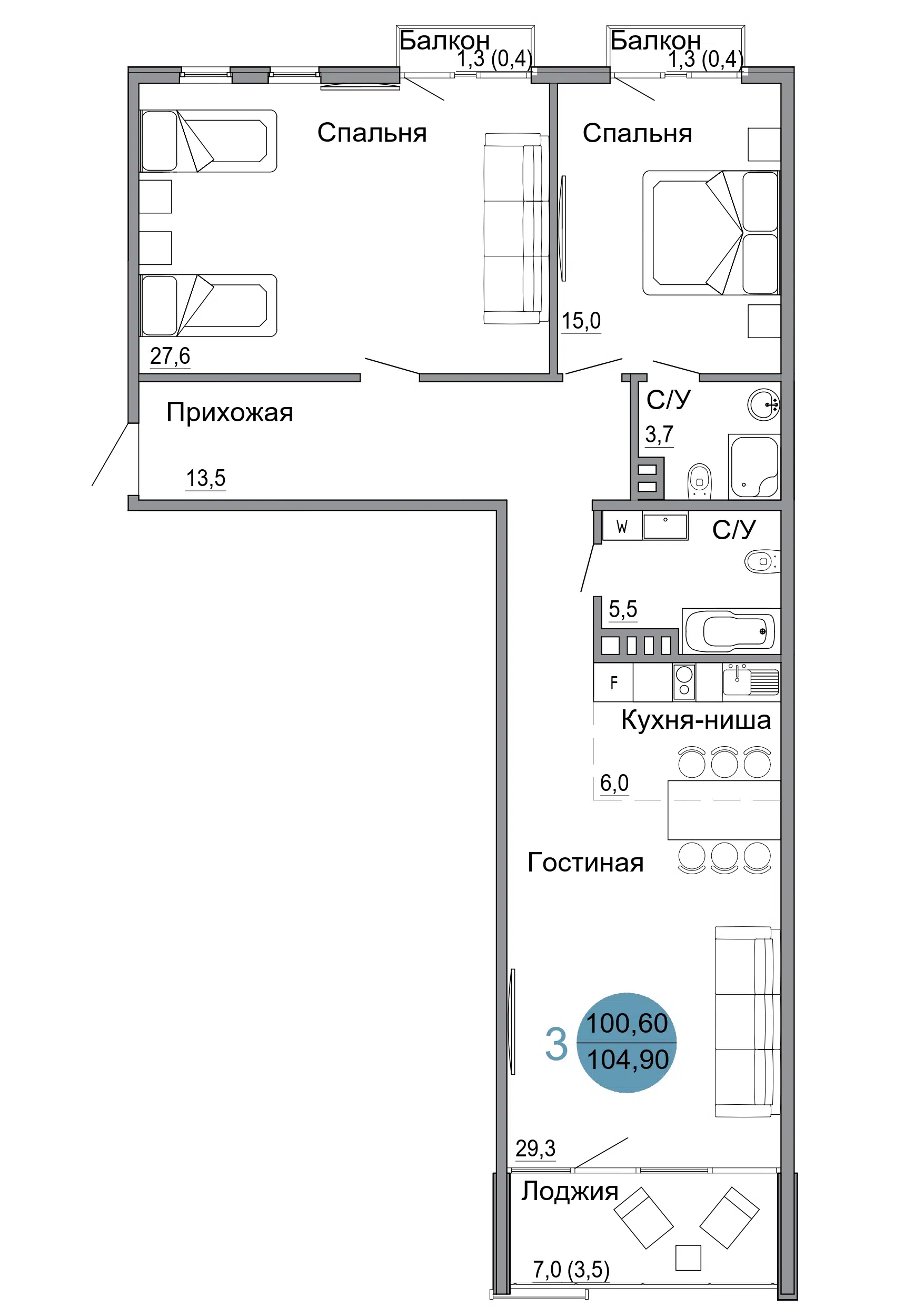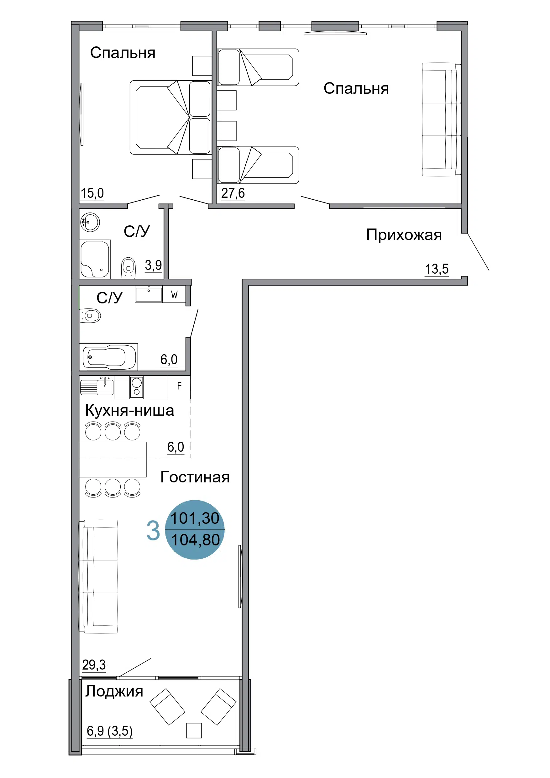3-комнатная квартира, 104.90 м², 2 эт.