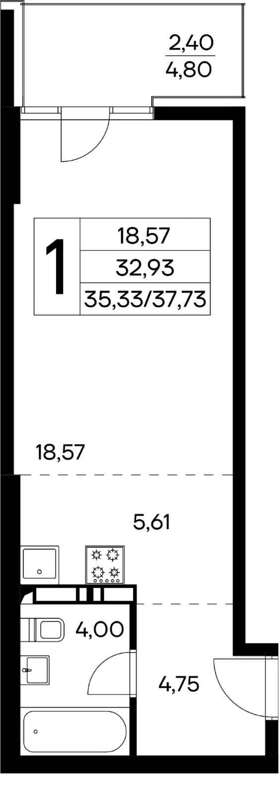 1-комнатная квартира, 46.96 м², 2 эт.
