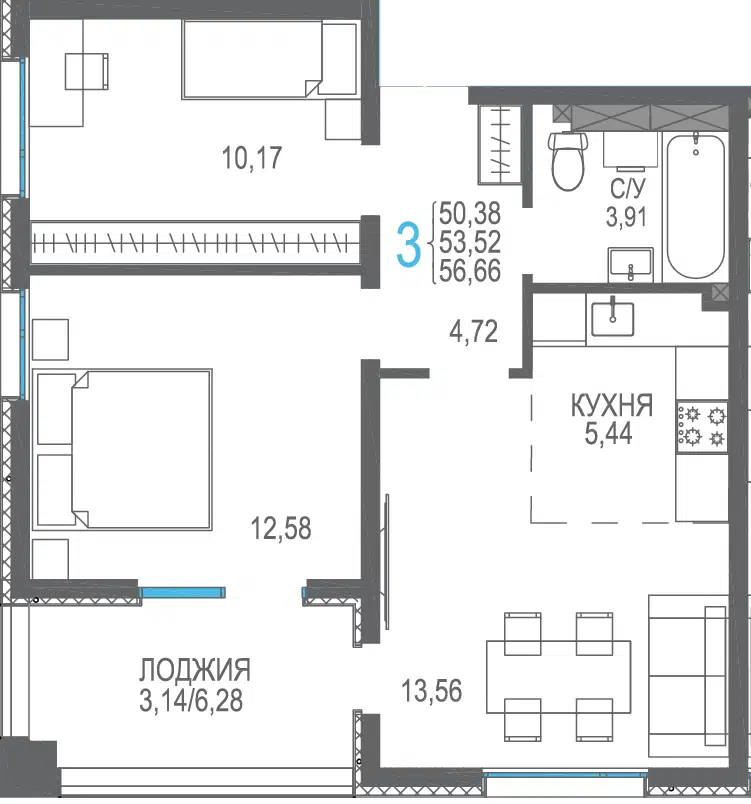 3-комнатная, 73.17 м²