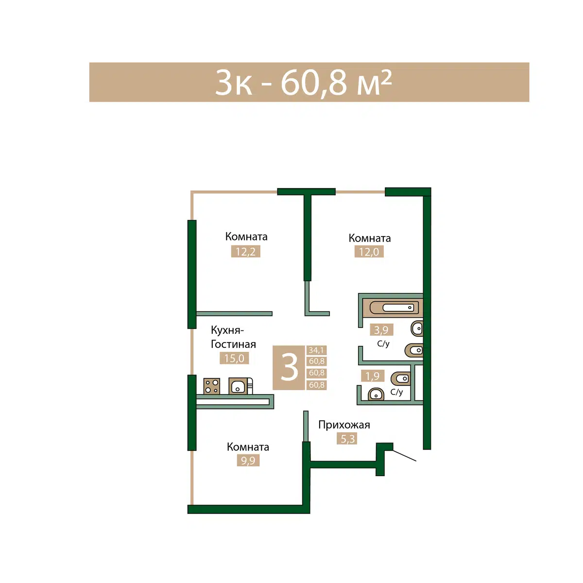 3-комнатная, 95.50 м²