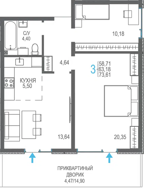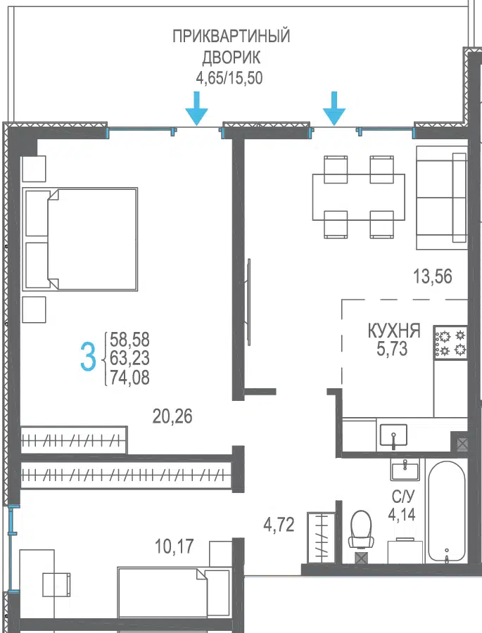 3-комнатная, 56.66 м²