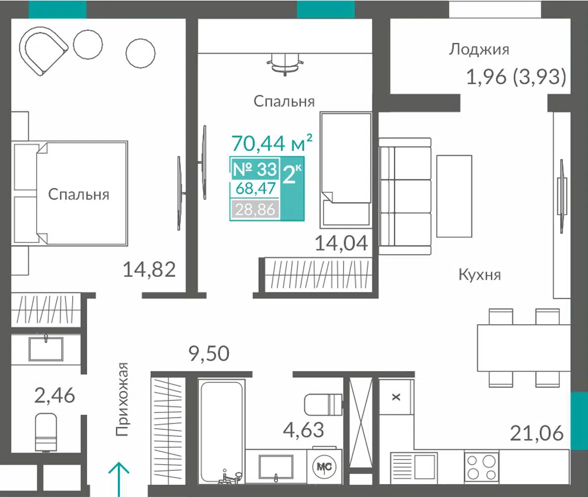 2-комнатная квартира, 66.96 м², 2 эт.