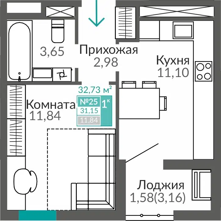 1-комнатная, 48.67 м²